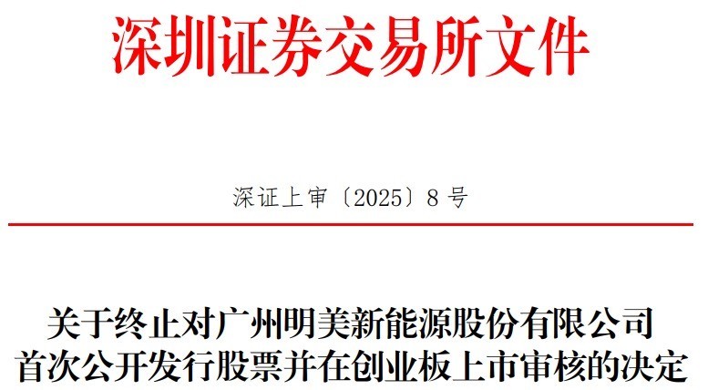 中国经济网北京1月13日讯 深交所网站昨日披露关于终止对广州明美新能源股份有限公司(简称“明美新能”)首次公开发行股票并在创业板上市审核的决定。