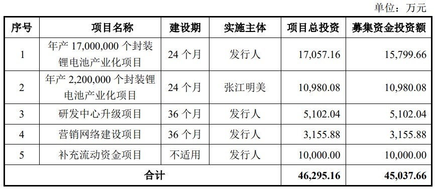 明美新能原拟在深交所创业板发行不超过4,252.08万股,占发行后总股本的比例不低于25%。本次发行全部为新股发行,不涉及股东公开发售股份的情形。公司原拟募资45,037.66万元,用于年产17,000,000个封装锂电池产业化项目、年产2,200,000个封装锂电池产业化项目、研发中心升级项目、营销网络建设项目、补充流动资金项目。