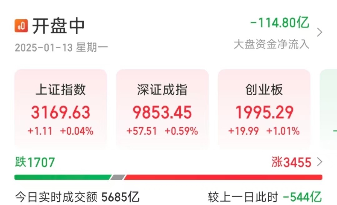 【大河财立方消息】1月13日,大盘低开高走。截至发稿,三大指数集体翻红,沪指涨0.04%,深证成指涨0.59%,创业板指涨1.01%。此前,创业板指、深证成指一度跌超1%。航运、锂矿、人形机器人、稀有金属等热门概念股涨幅居前。